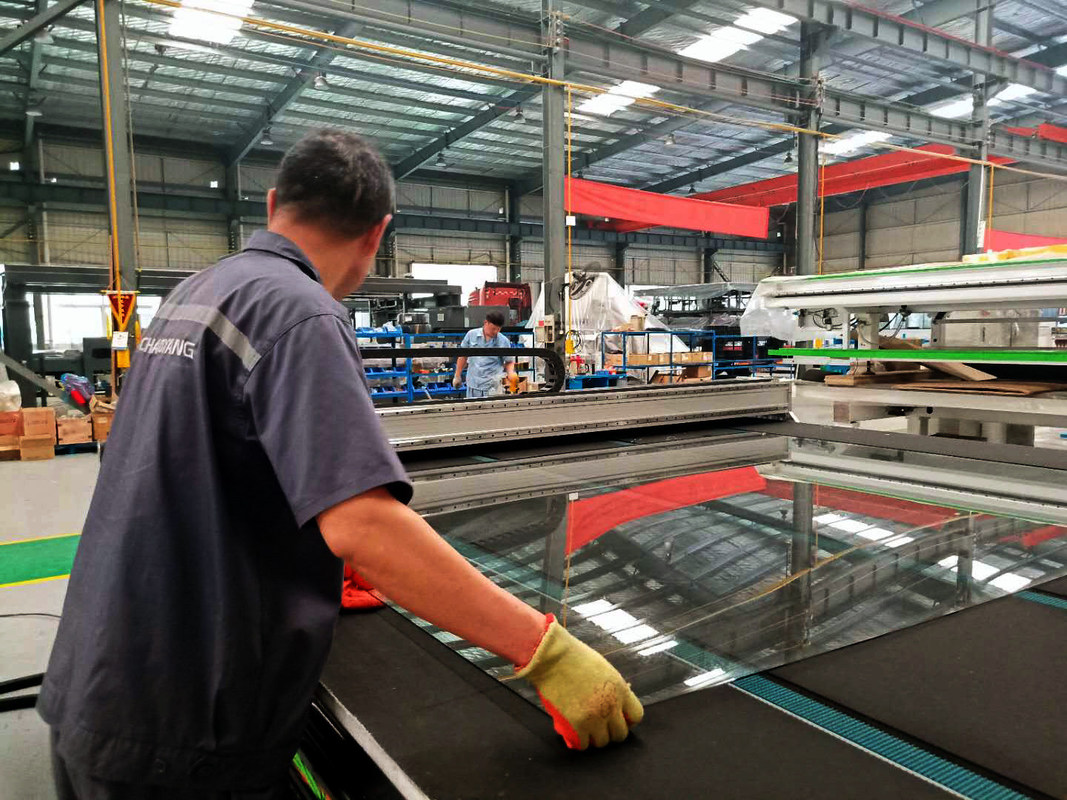 次にその働く主義は仕事台へベルトを運ぶことによって切子ガラスを運ぶことでしたり光電スキャン システムを通して自動的にガラスの位置、およびプログラム制御、cutcによってXおよびYの方向に沿うカッターのホールダー移動のダイヤモンド車輪が付いている髭剃り部をそれぞれシート入れた。CNCの動きのコントローラーは機械の制御部品で使用され、高度ACサーボ モーターはドライブ部品で使用される。