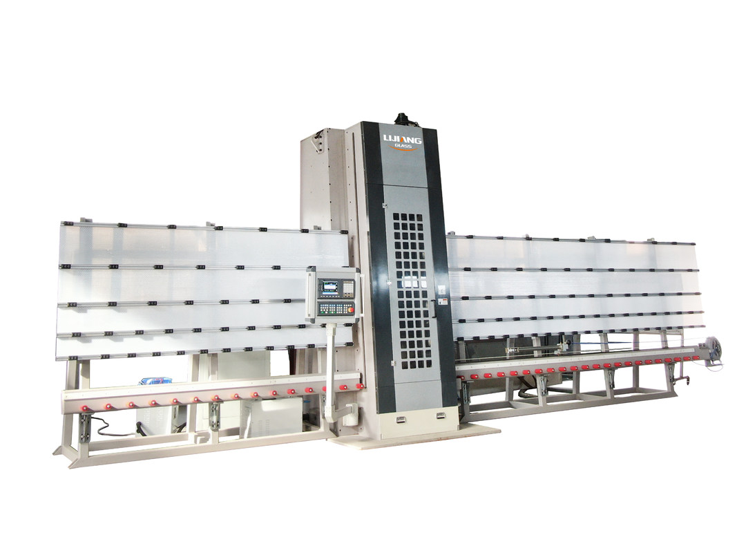 垂直のガラス加工機. 主要な部分は全て保護用で覆われています. 構造は,機械を積んだり,卸したりするのに便利で,面積が少なくなります.また,ガラスのシートを処理しやすい障害を減らすことができます.冷却水システムに優れているのです